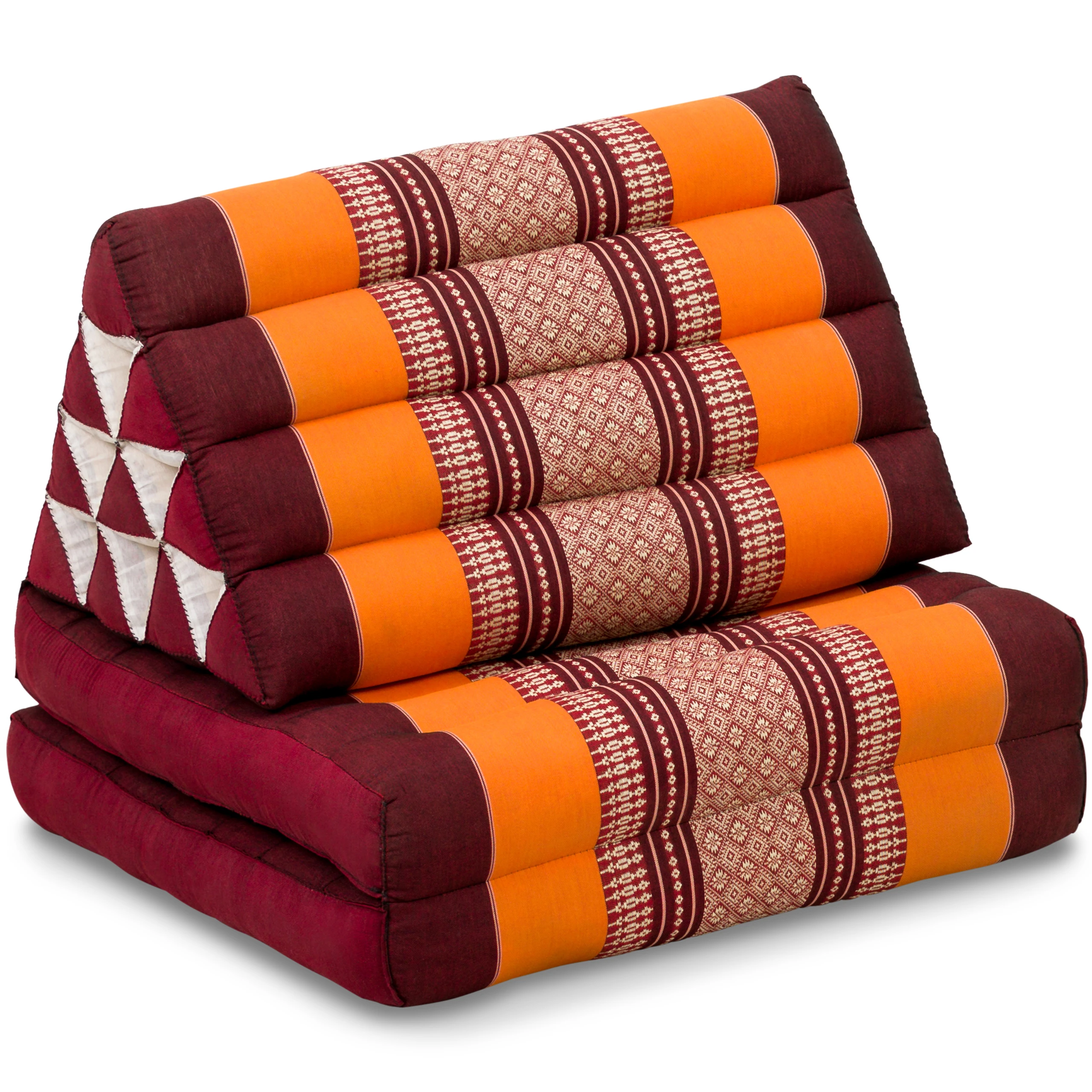 Het kussen met de bijzondere driehoekige vorm is een begrip in Thailand en vormt een karakteristieke zachte ondersteuning om op te zitten en liggen. Het Thaise kussen kan eenvoudig worden uitgeklapt en ziet er in uitgevouwen toestand uit als een uitnodigend groot ligvlak. Het geïntegreerde driehoekige kussen dient als rugleuning. Het vormvaste kussen is handgemaakt en robuust – daar moet je wel relaxed tegenaan leunen!